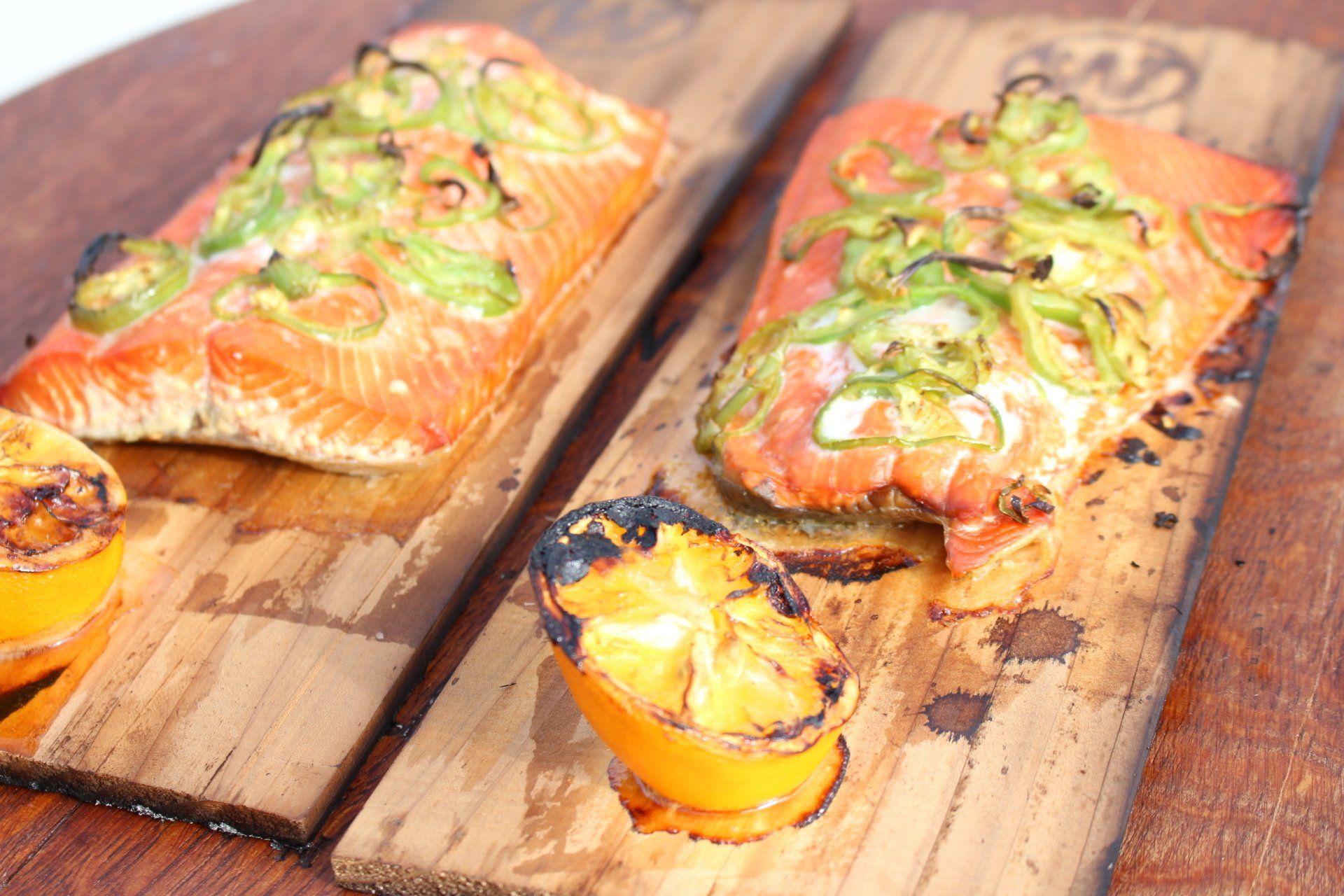 - Turn the plank over. Place the Salmon, skin side down on top of the charred side of the plank. Sprinkle with the sliced peppers and cook for 15-20 minutes until the salmon is cooked. Times may differ depending on the thickness of the fish, so check for doneness by inserting a sharp knife into the flesh - the flesh should be opaque in the middle. For best results, at least half of the cooking time should be with the lid closed to infuse the wood chip flavor.