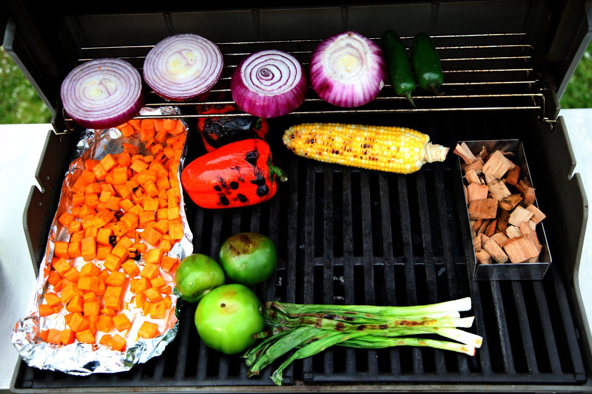 - Once the grill is hot and the chips are smoking, place the vegetables on to the grill and grill until the vegetables are tender and cooked through (about 10-15 minutes) turning over halfway through. The sweet potatoes will take about 20-25 minutes to cook. For best results, at least half of the cooking time should be with the lid closed to infuse the wood chip flavor.