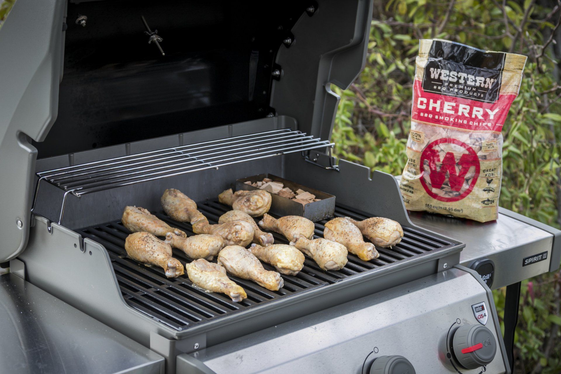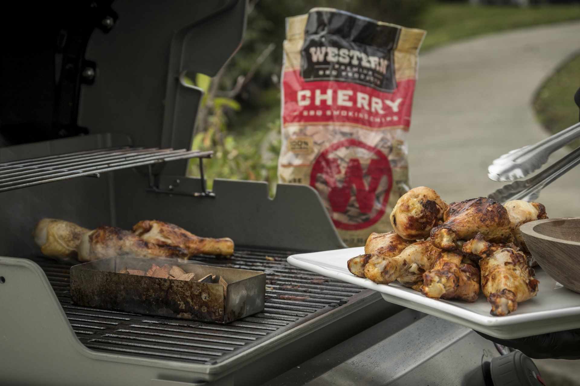 - For a gas grill, preheat to medium-high and place Western Cherry Wood Chips in a smoking tray or arrange in a foil pack and place directly over the hottest part of the grill. For a charcoal grill, prepare a fire and then place a handful of Western Cherry Chips directly on your hot coals or place chips in a smoking tray and place on the grill.