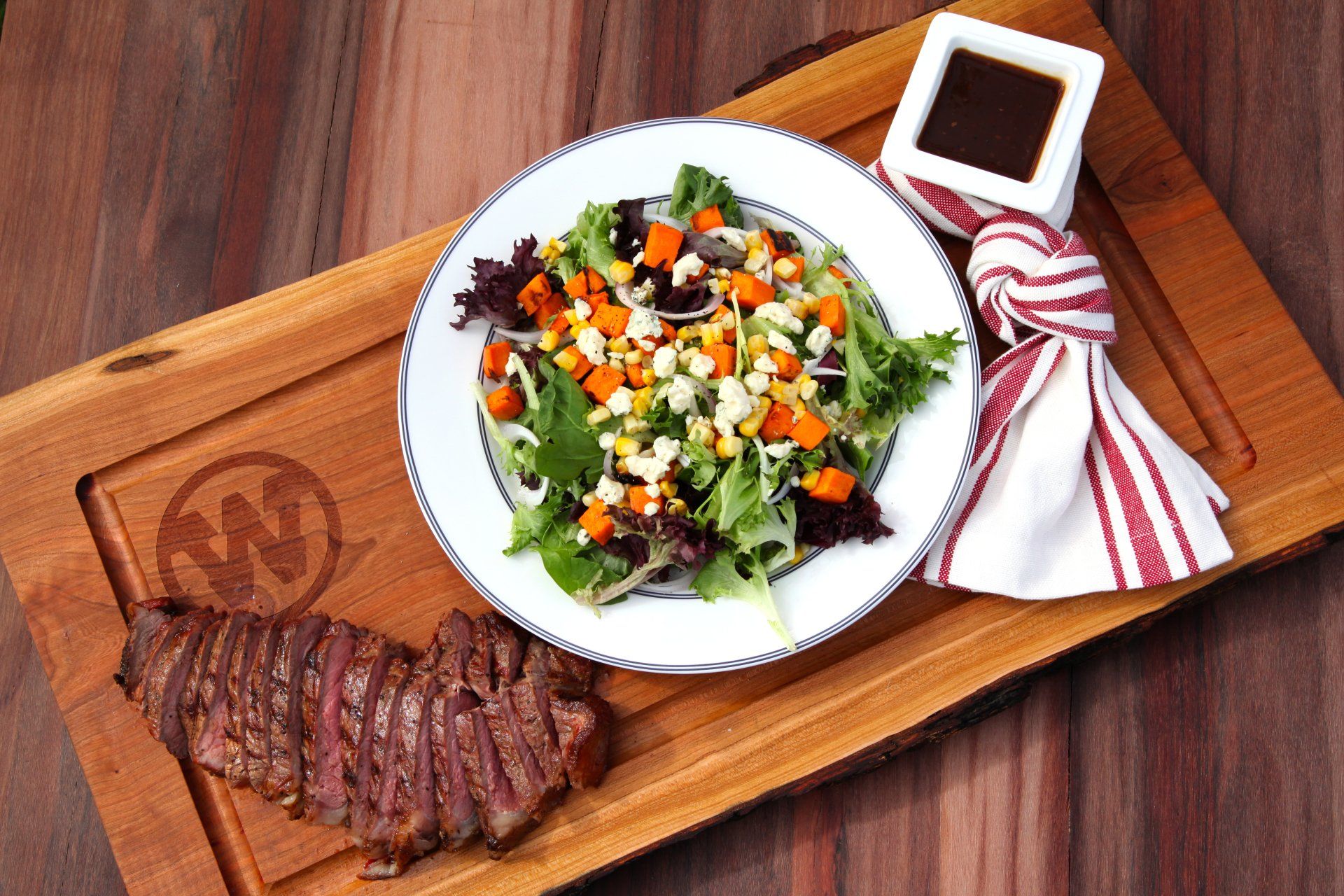 - Add the spring mix, roasted sweet potatoes, red onion, and corn to the bowl with the dressing and toss to coat. Fan the steak over the salad and sprinkle with blue cheese.